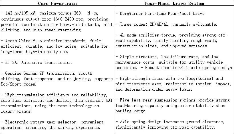 The 2026 RE-MAX 2.5T Automatic 4WD model boasts the core advantages of an Isuzu 2.5T diesel engine + ZF 8AT transmission + BorgWarner part-time 4WD + HanDun chassis, emphasizing ease of use, reliable 4WD, heavy-duty durability, and suitability for both family and commercial use.