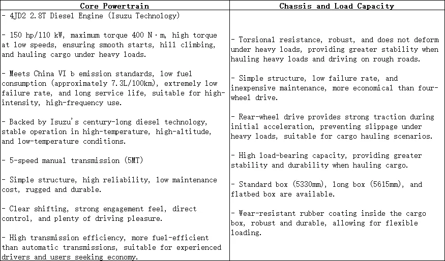 The 2026 RE-MAX 2.8T manual 2WD pickup truck's core advantages are its classic Isuzu large-displacement diesel engine + 5MT manual transmission + rear-wheel drive + robust chassis. It emphasizes durability, powerful performance under heavy loads, fuel efficiency, and quick return on investment, making it the top choice for users with a purely utility-oriented needs and limited budgets.