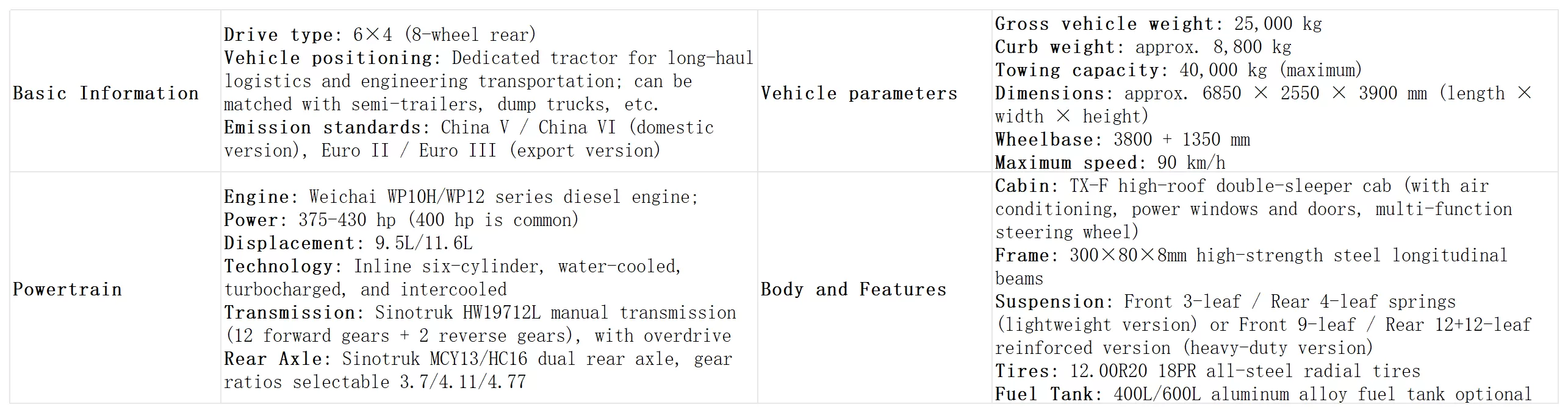 The core parameters of this Sinotruk Howo TX 6×4 tractor truck (chassis version) are as follows:
